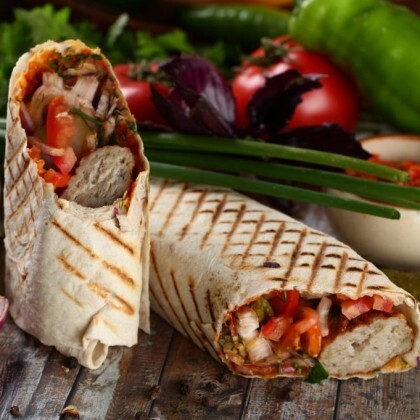 Лаваш, фирменный соус, салат, помидоры, огурцы, лук, майонез, горчица, колбаски баварские, барбекю соус.